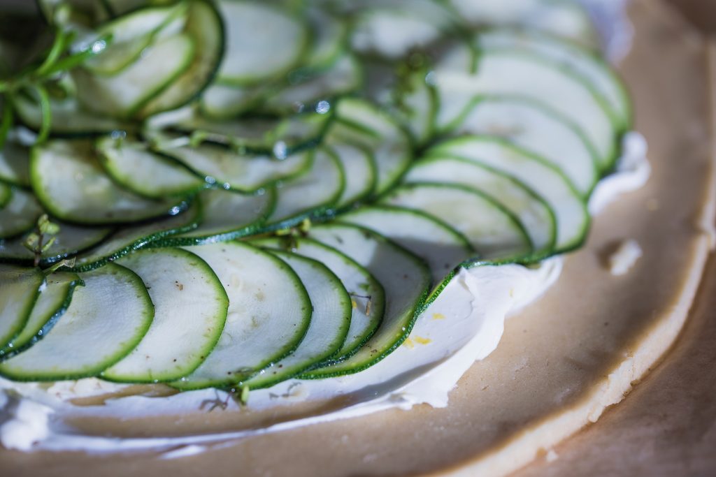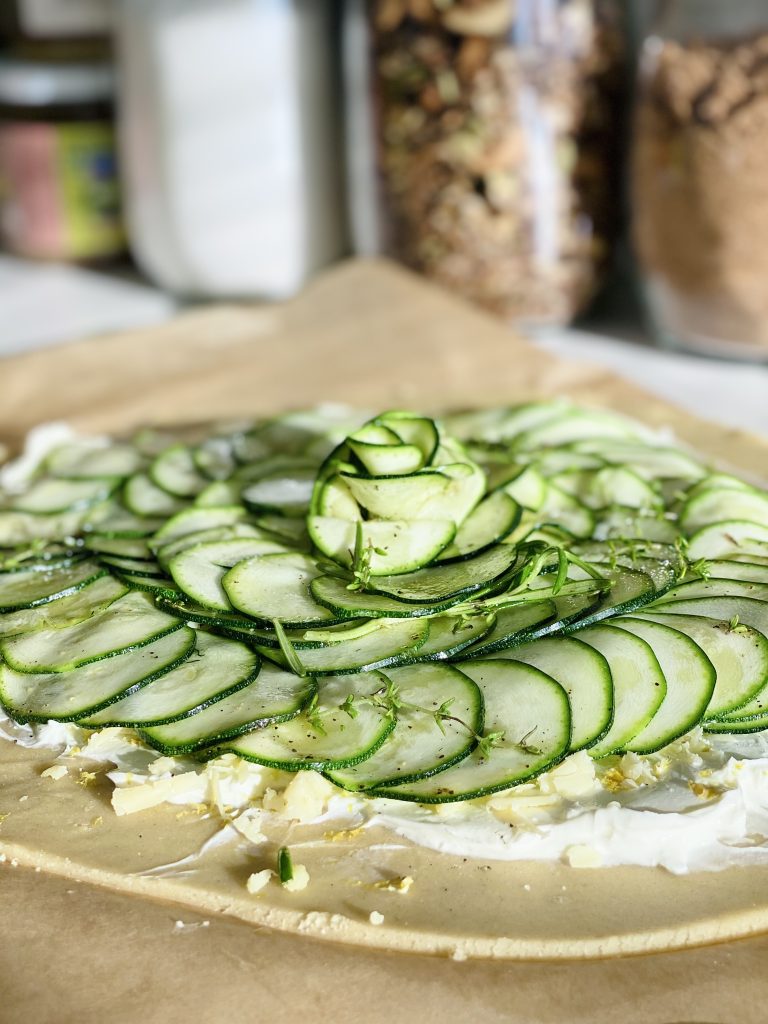 - Bred ut oströran på degplattan, men lämna 2–3 cm fri kant runt om. Lägg squashskivorna ovanpå i ett fint mönster. Vik upp kanterna och pensla dem med uppvispat ägg. Toppa med resten av den rivna osten.