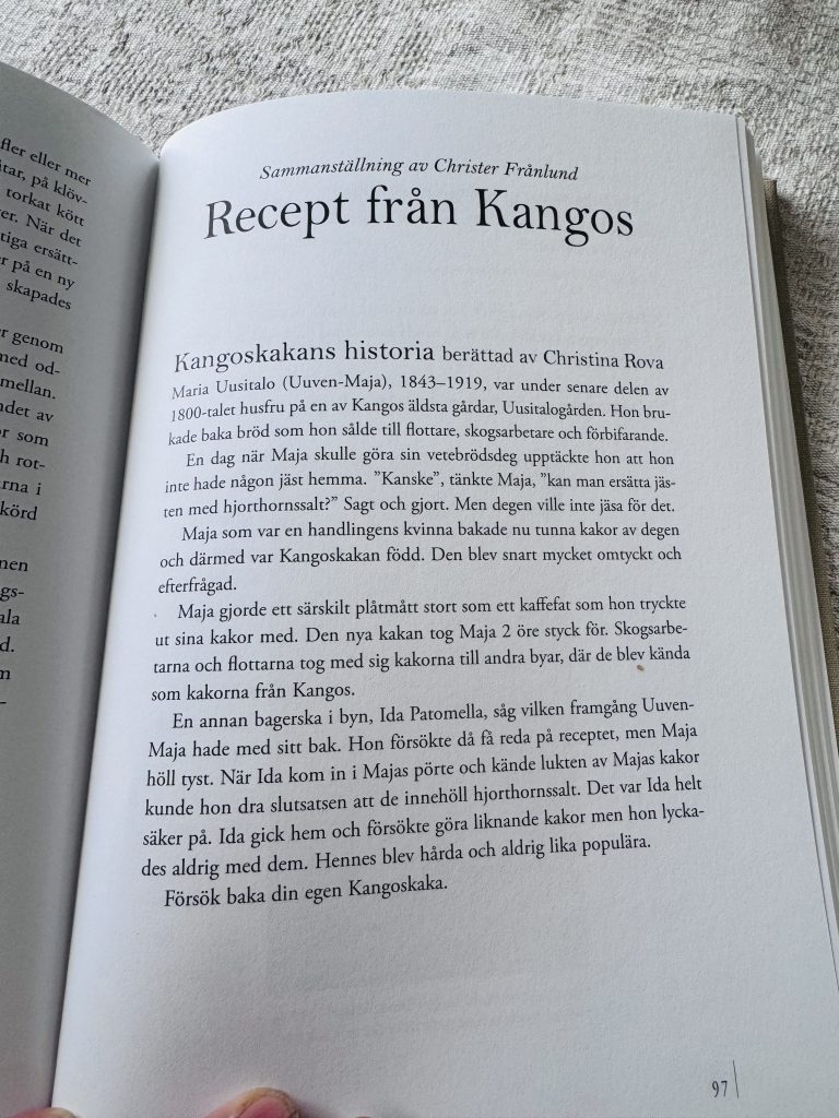 Man kan nästan höra hur kakorna berättar sin historia, generationer av starka händer som knådat, kavlat och gräddat. En dag i somras fick jag äran att möta en äkta ättling till upphovskvinnan av Kangoskakan. Jag hade tjatat, nåväl starkt föreslagit, för min kompis Sofie att vi skulle åka till Kangos på våran roadtrip. Det krävdes ingen övertalning alls. Vi for dit, jag började fråga runt (som vanligt) och abrakadabra! som ett mirakel fanns det Kangoskakor att köpa på idrottsplatsen. Vi informerades att det fanns på affären också, dom var lite annorlunda. Beror på vad en gillar. Vi tog Hjördis till affären, men där var det slut! Men personalen hjälpte oss att ringa bagerskan. Och kan ni tro, vi fick komma förbi och hon bjöd på kaffe och berättade historian om Kangoskakan. Gun är nämligen 5:e generationen sedan Maja Uusitalo som uppfann kakan en dag när hon saknade andra jäsmedel och löste det med hjorthornssalt. Det var stort för mig och Sofie att få fika vid hennes köksbord. Tack så jättemycket Gun!